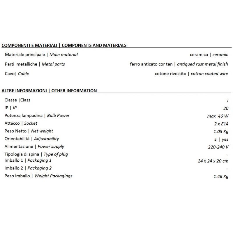 | Materiale | ceramica si metal cu detalii specifice pentru un efect antichizat, cablu textil |