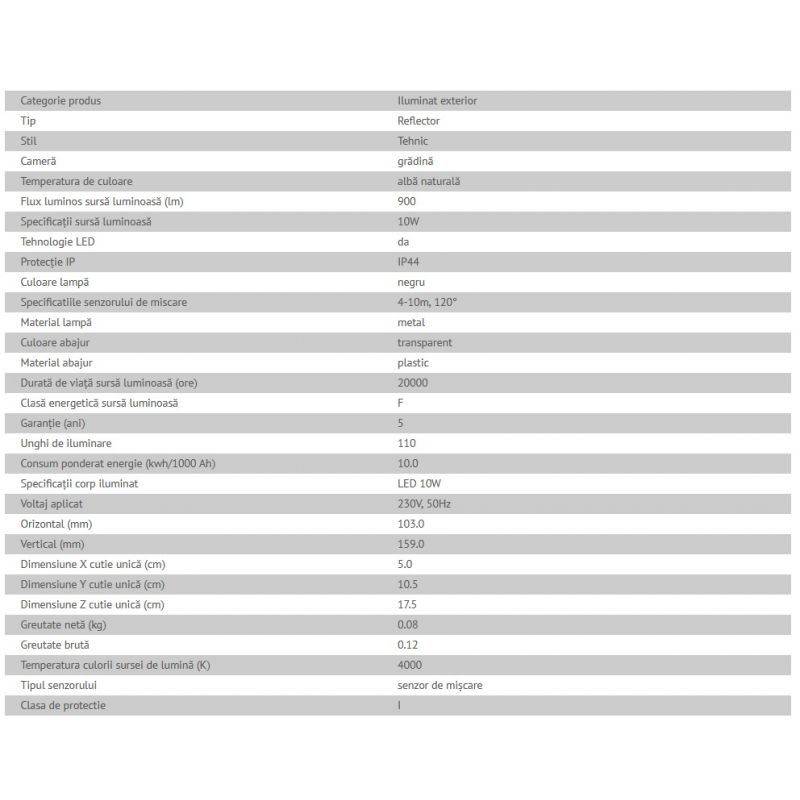 Informatii produs: | senzorul lămpii detectează mișcarea de la o distanță de 4-10metri la un unghi de vizualizare de 120°, protectie IP44 |