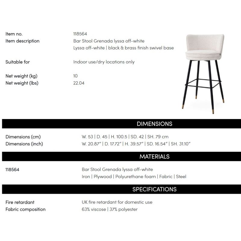 | Materiale | baza pivotanta, cadru din metal negru cu detalii finisaj alama, tapiterie din tesatura lyssa 63% viscoza, 37% poliester |
