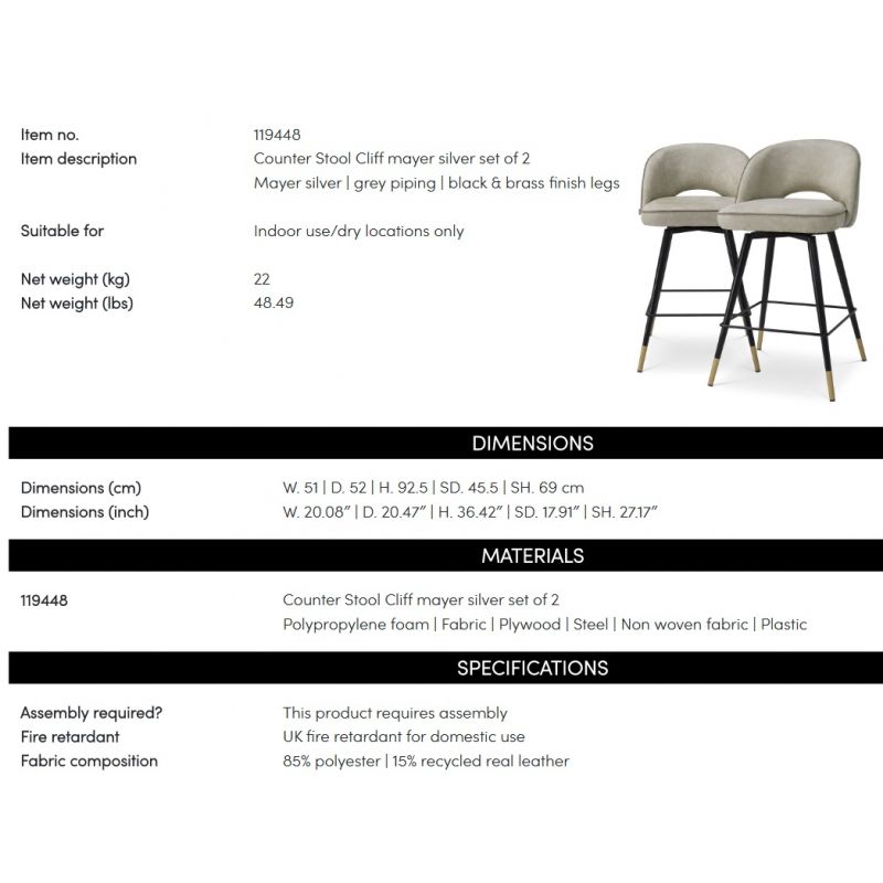 | Descriere | picioare metalice negre cu detalii din alama, placaj, tapiterie tesatura Mayer silver, umplutura spuma |