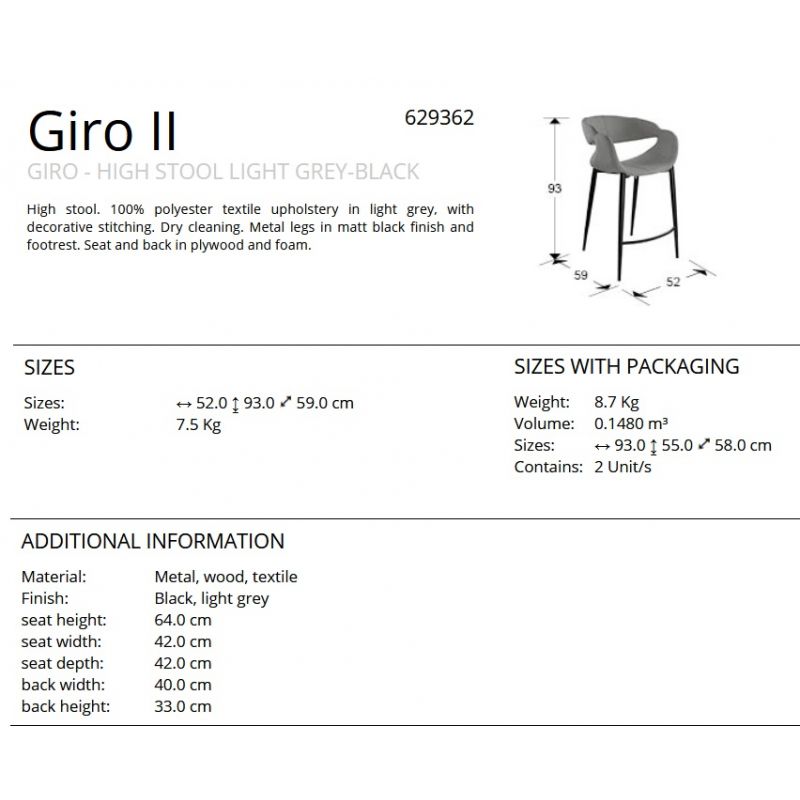 | Materiale | picioare din metal finisaj negru mat, sezut si spatar din placaj umplut cu spuma, tapiterie textila din poliester 100%, cusaturi decorative |