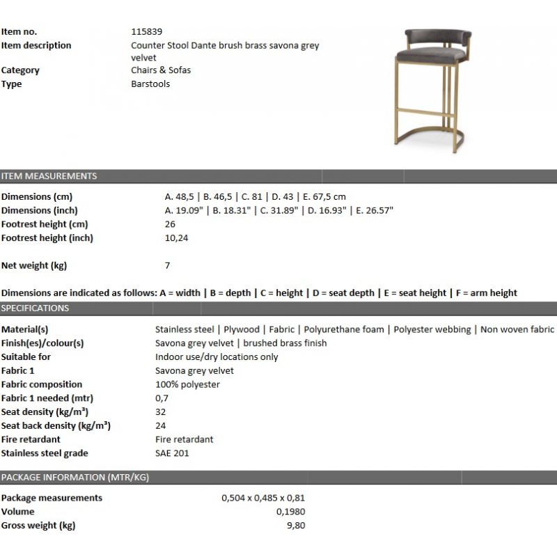 | Descriere | Scaun realizat din otel inoxidabil finisaj alama periata, placaj, tesatura din catifea gri 100% poliester, umplutura spuma |