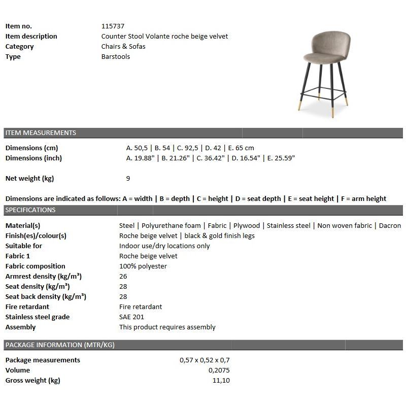 | Descriere | Scaun realizat din otel finisaj negru cu accente aurii, tapiterie din catifea roche bej- 100% poliester, placaj, umplutura spuma |