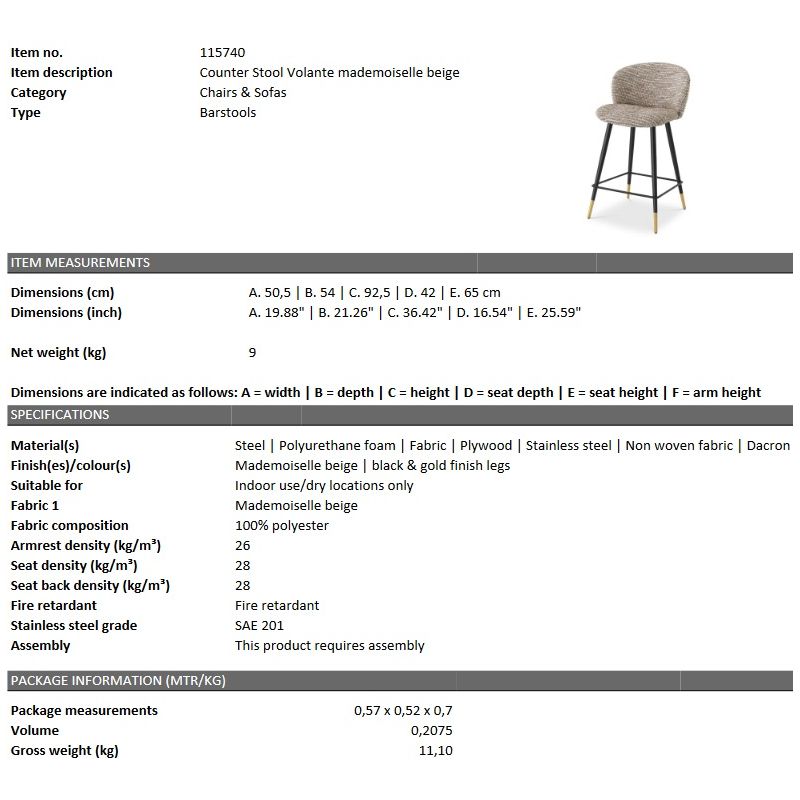 | Descriere | Scaun realizat din otel finisaj negru cu accente aurii, tapiterie din tesatura bej mademoiselle- 93% poliester/7% viscoza, placaj, umplutura spuma |