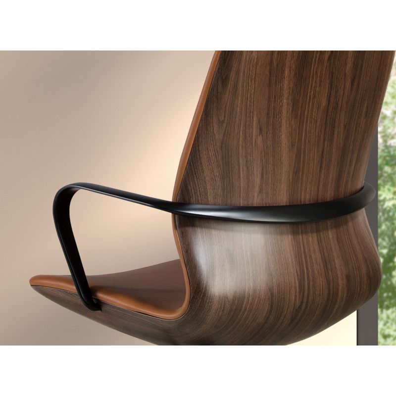 | Materiale | picioare din otel inoxidabil negru, sezut din piele sintetica maro, carcasa furnir din lemn de nuc curbat, pivotant 360 grade, inaltime reglabila |