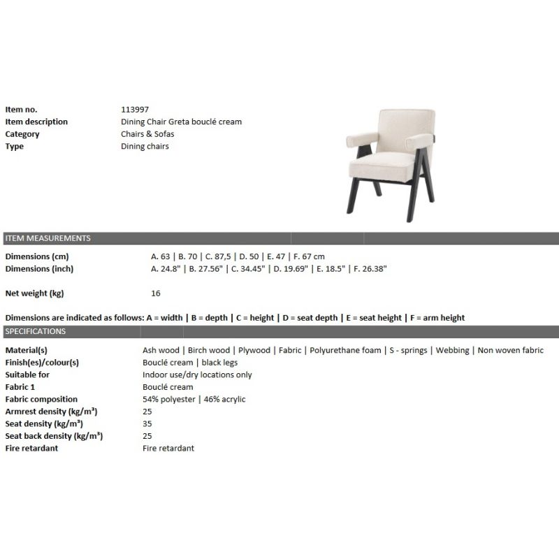 | Descriere | lemn de frasin, lemn de mesteacan finisaj negru, placaj, tapiterie Bouclé crem-54% poliester/ 46% acril, umplutura spuma poliuretanica, arcuri |