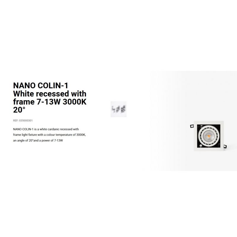 Informatii produs: | spot LED incastrabil NANO COLIN-1 cu grad de iluminare 20 grade, IP23, datorită luminii de 3000K acest spot permite crearea unor atmosfere calde și confortabile, ideal pentru spatii publice, comeciale |