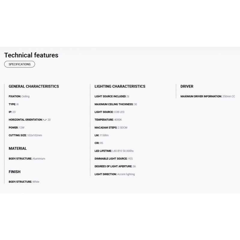 Putere | 12Watt modul LED COB dimabil incorporat, 1150LM, 4000K, CRI 85, driver exclus din pret ( Dali, Casambi sau Triac) |