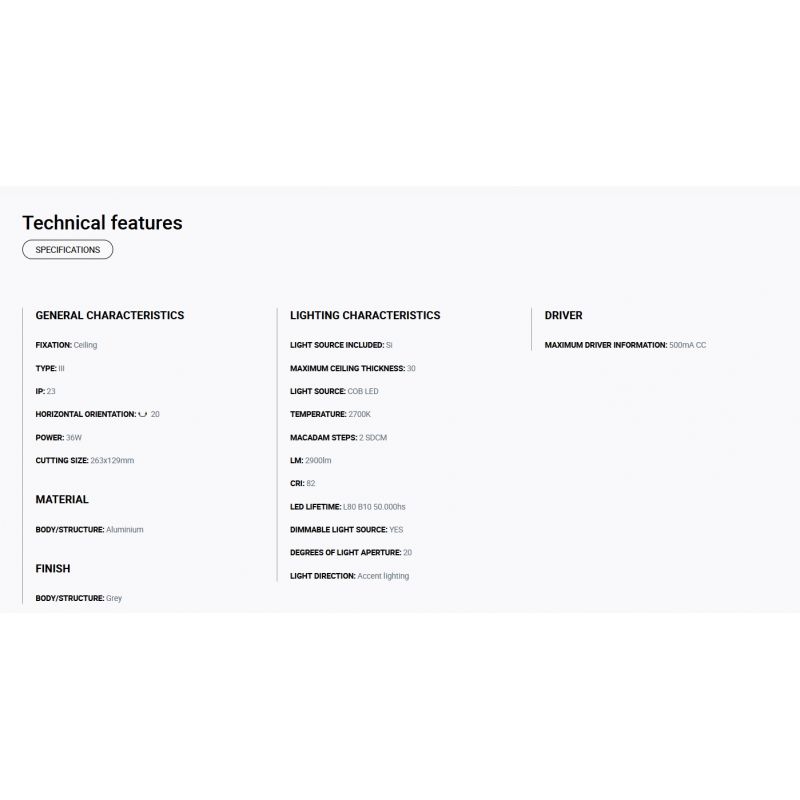 Putere | 36Watt modul LED COB dimabil incorporat, 2900LM, 2700K, CRI 82, driver exclus din pret ( Dali, Casambi sau Triac) |