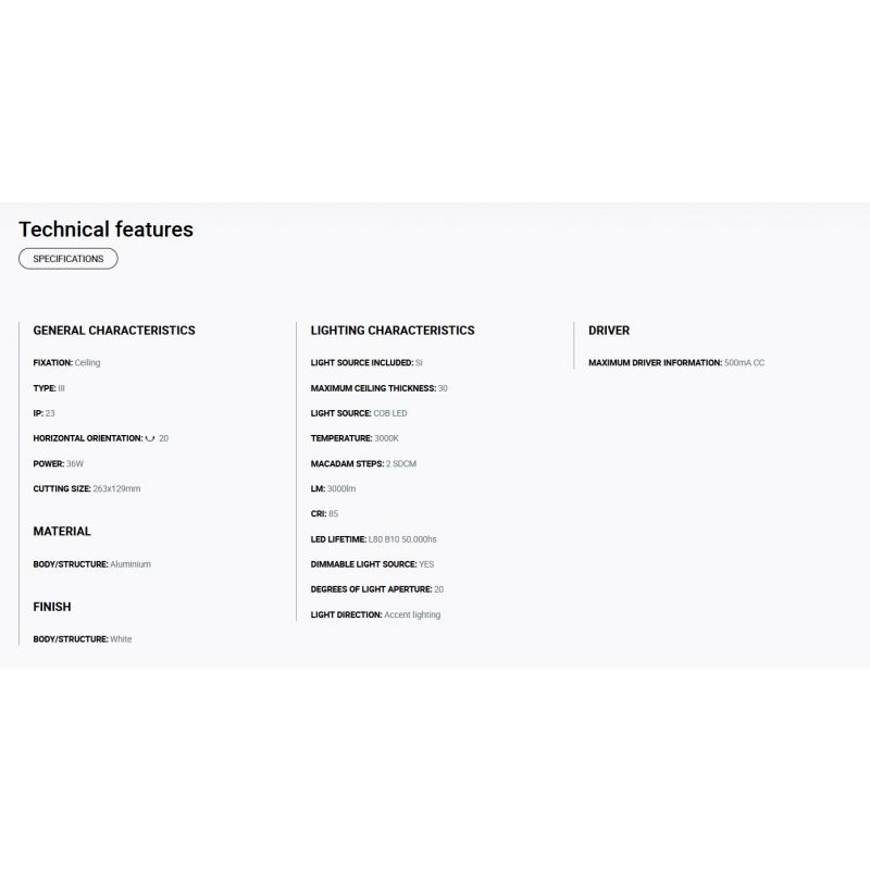 Putere | 36Watt modul LED COB dimabil incorporat, 3000LM, 3000K, CRI 85, driver exclus din pret ( Dali, Casambi sau Triac) |