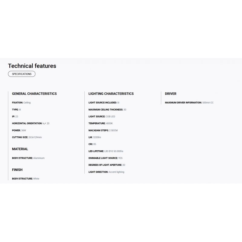 Putere | 36Watt modul LED COB dimabil incorporat, 3200LM, 4000K, CRI 85, driver exclus din pret ( Dali, Casambi sau Triac) |