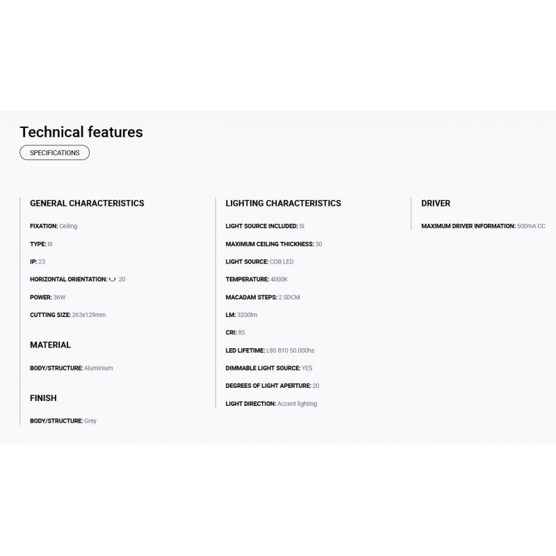 Putere | 36Watt modul LED COB dimabil incorporat, 3200LM, 4000K, CRI 85, driver exclus din pret ( Dali, Casambi sau Triac) |