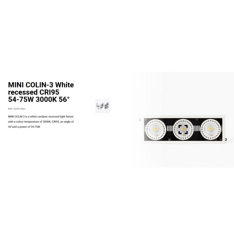 Informatii produs: | spot LED incastrabil MINI COLIN-3 cu grad de iluminare 56 grade, IP23, datorită luminii de 3000K acest spot permite crearea unor atmosfere calde si confortabile, ideal pentru spatii publice, comerciale |