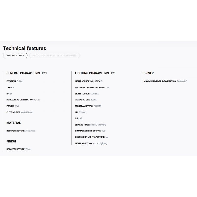 Putere | 72Watt modul LED COB dimabil incorporat, 5550LM, 3000K, CRI 85, driver exclus din pret ( Dali, Casambi sau Triac) |
