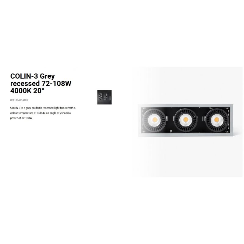 Informatii produs: | spot LED incastrabil COLIN-3 cu grad de iluminare 20 grade, IP23, datorită luminii de 4000K acest spot permite crearea unor atmosfere confortabile, ideal pentru spatii publice, comerciale |