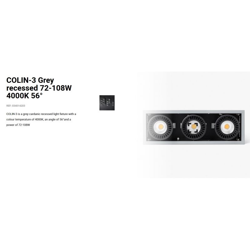 Informatii produs: | spot LED incastrabil COLIN-3 cu grad de iluminare 56 grade, IP23, datorită luminii de 4000K acest spot permite crearea unor atmosfere confortabile, ideal pentru spatii publice, comerciale |