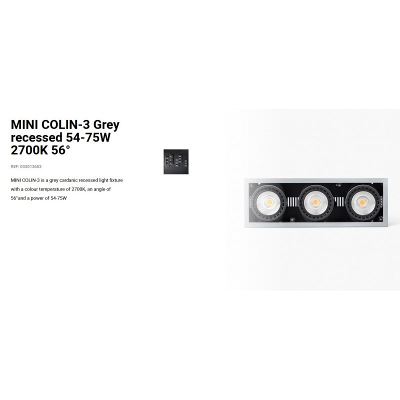 Informatii produs: | spot LED incastrabil MINI COLIN-3 cu grad de iluminare 56 grade, IP23, datorită luminii de 2700K acest spot permite crearea unor atmosfere confortabile, ideal pentru spatii publice, comeciale |
