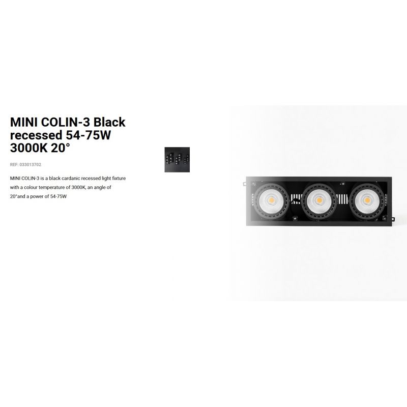Informatii produs: | spot LED incastrabil MINI COLIN-3 cu grad de iluminare 20 grade, IP23, datorită luminii de 3000K acest spot permite crearea unor atmosfere calde si confortabile, ideal pentru spatii publice, comeciale |