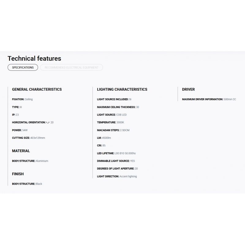 Putere | 54Watt modul LED COB dimabil incorporat, 4500LM, 3000K, CRI 85, driver exclus din pret ( Dali, Casambi sau Triac) |