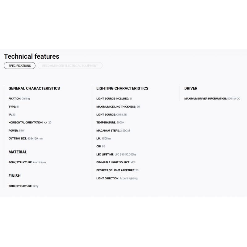 Putere | 54Watt modul LED COB dimabil incorporat, 4500LM, 3000K, CRI 85, driver exclus din pret ( Dali, Casambi sau Triac) |