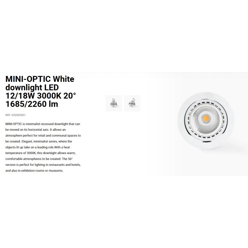 | Informatii produs: | spot LED incastrabil MINI-OPTIC cu grad de iluminare 20 grade, IP23, poate fi deplasat pe axa orizontală, datorită luminii de 3000K acest spot permite crearea unor atmosfere calde si confortabile, ideal pentru spatii publice, comerciale |