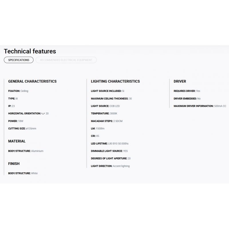 | Putere | 18Watt modul LED COB dimabil incorporat,1500LM, 3000K, CRI 85, driver exclus din pret ( Dali, Casambi sau Triac) |