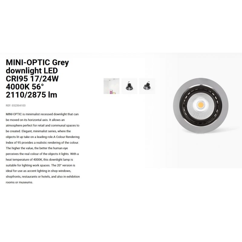 Informatii produs: | spot LED incastrabil MINI-OPTIC cu grad de iluminare 56 grade, IP23, poate fi deplasat pe axa orizontală, datorită luminii de 4000K acest spot permite crearea unor atmosfere confortabile, ideal pentru spatii publice, comerciale |