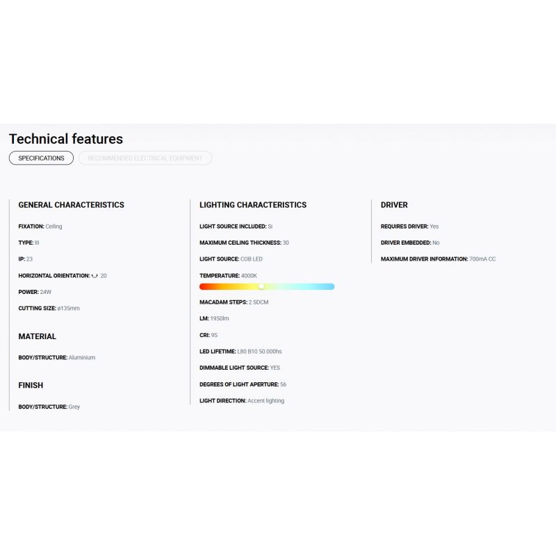 Putere | 24Watt modul LED COB dimabil incorporat,1950LM, 4000K, CRI 95, driver exclus din pret ( Dali, Casambi sau Triac) |