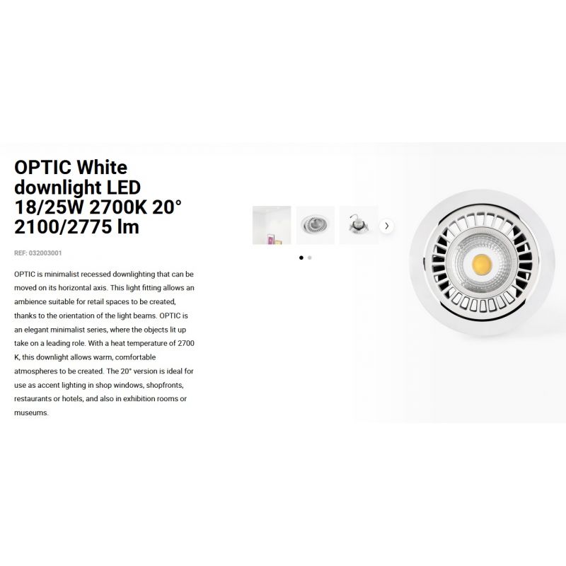 Informatii produs: | spot LED incastrabil OPTIC cu grad de iluminare 20 grade, IP23, poate fi deplasat pe axa orizontală, datorită luminii de 2700K acest spot permite crearea unor atmosfere calde si confortabile, ideal pentru spatii publice, comerciale |