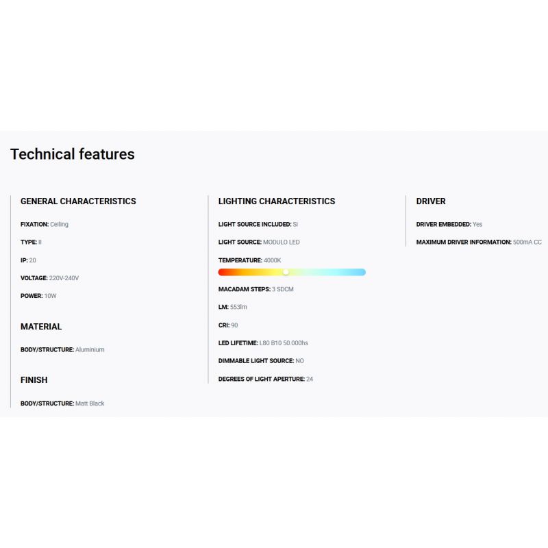 Putere | 10Watt modul LED incorporat, 553LM, 4000K, CRI 90 + driver inclus din pret |