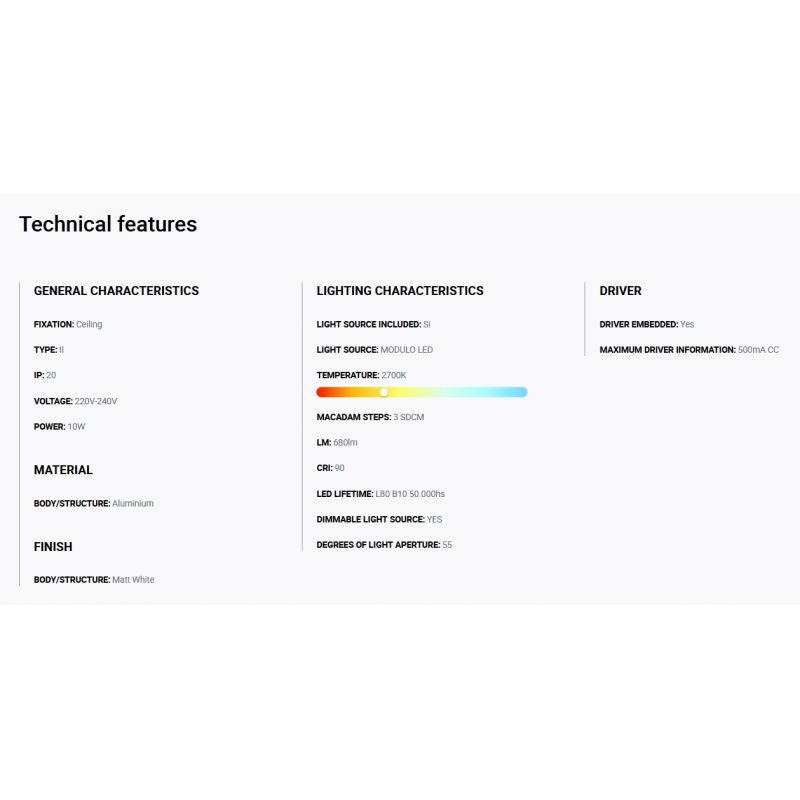 Dimensiuni | diametru:8,2cm; inaltime:10,6cm; diametru decupaj tavan:7,6cm |