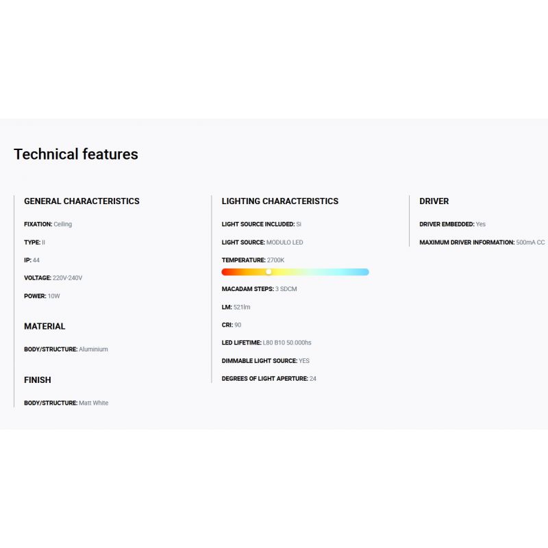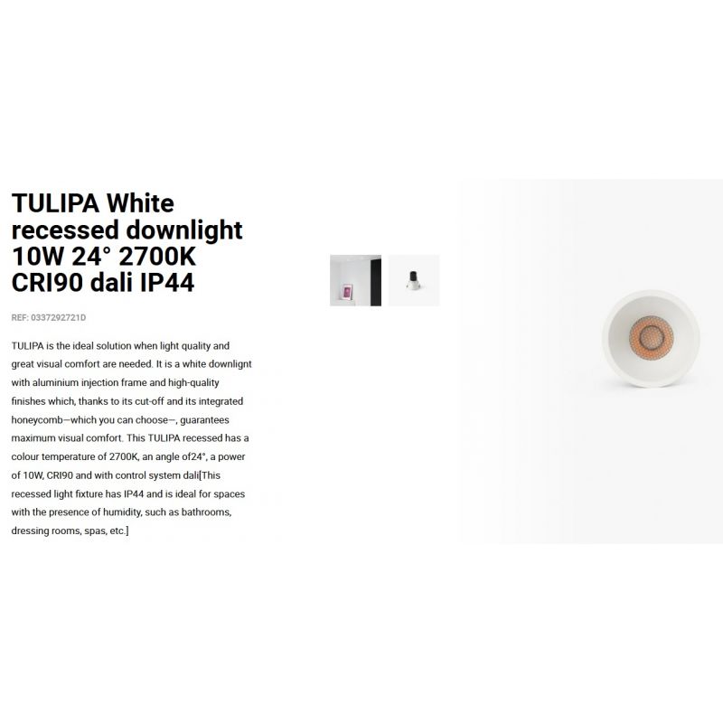Informatii produs: | spot LED incastrabil TULIPA cu grad de protectie la umiditate de IP44, iluminare 24 grade + driver cu sistem de control Dali inclus |