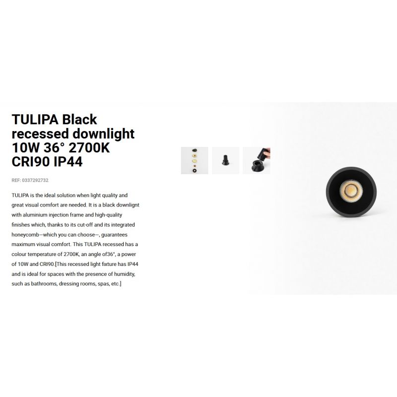 TULIPA este soluția ideală atunci când este nevoie de calitatea luminii și de un confort vizual deosebit. Este un spot incastrabil cu cadru de injecție din aluminiu și finisaje de înaltă calitate care garantează confort vizual maxim, corp de iluminat încastrat are IP44 și este ideal pentru spațiile cu prezența umidității, precum băi, dressinguri, spa-uri etc.