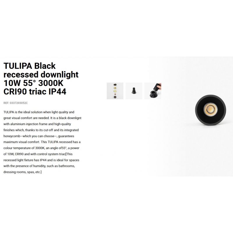 TULIPA este soluția ideală atunci când este nevoie de calitatea luminii și de un confort vizual deosebit. Este un spot incastrabil cu cadru de injecție din aluminiu și finisaje de înaltă calitate care garantează confort vizual maxim, corp de iluminat încastrat are IP44 și este ideal pentru spațiile cu prezența umidității, precum băi, dressinguri, spa-uri etc.