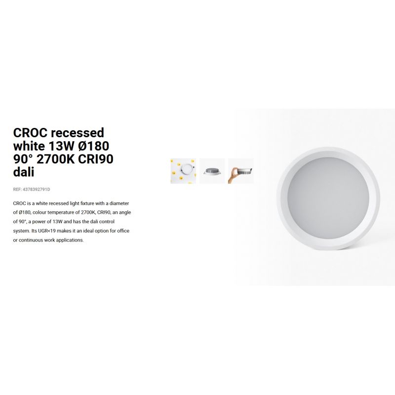 CROC este un corp de iluminat alb incastrat, optica microprismatică pentru controlul strălucirii îl face o opțiune perfectă pentru iluminatul general al spatiilor comerciale si rezidentialeare, datorita protectiei IP44 este ideal pentru spațiile cu prezența umidității.
