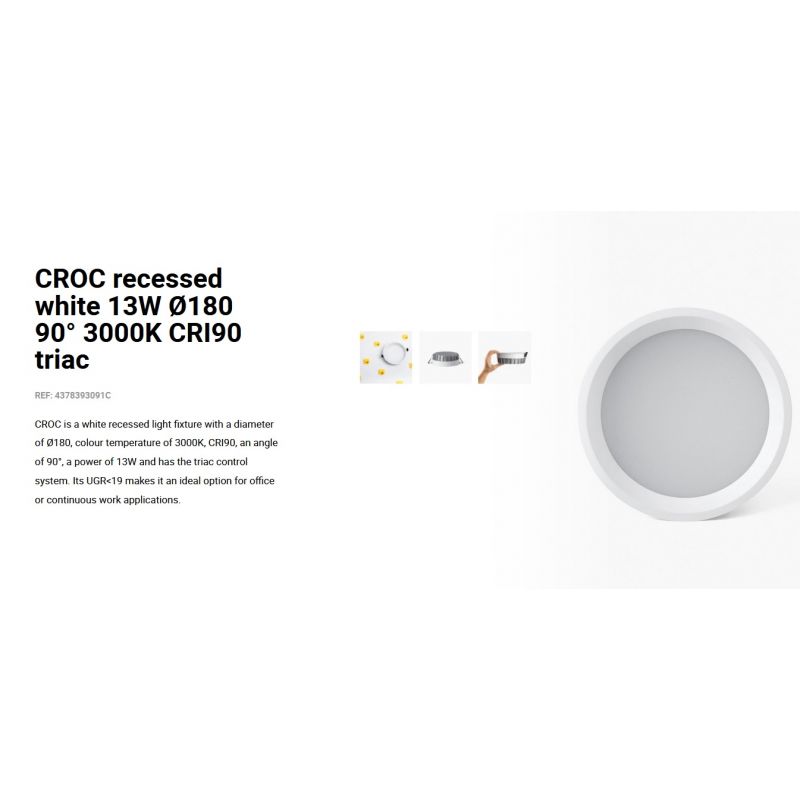 Vezi fișa cu informații despre produsCROC este un corp de iluminat alb incastrat, optica microprismatică pentru controlul strălucirii îl face o opțiune perfectă pentru iluminatul general al spatiilor comerciale si rezidentialeare, datorita protectiei IP44 este ideal pentru spațiile cu prezența umidității.