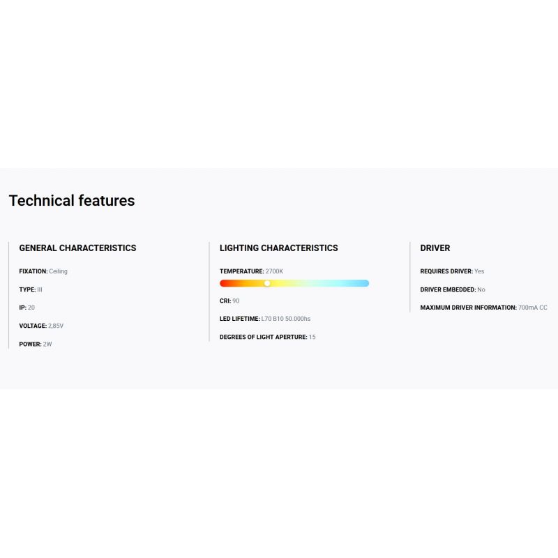 Putere | 2Watt modul LED dimabil incorporat, 2700K, CRI 90, driver exclus din pret ( Dali, Casambi sau Triac) |