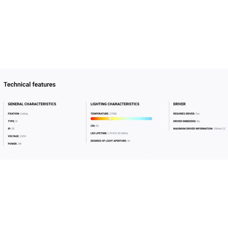Putere | 2Watt modul LED dimabil incorporat, 204Lm, 2700K, CRI 90, driver exclus din pret ( Dali, Casambi sau Triac) |