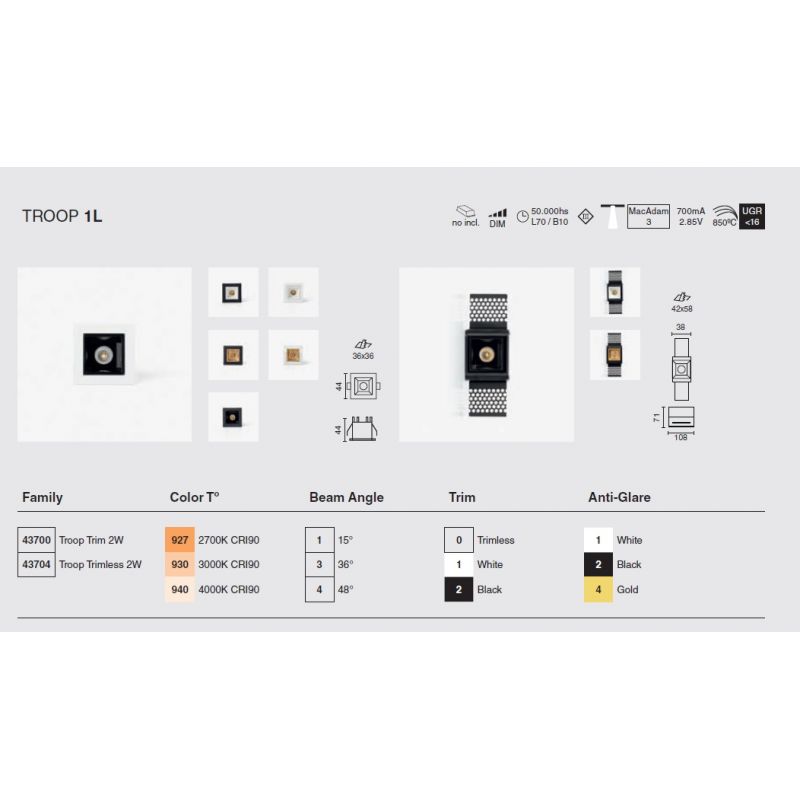TROOP este un corp de iluminat încastrat din aluminiu injectat care este ușor de instalat și proiectat pentru iluminarea spațiilor comerciale si rezidentialeare cu finisaje de înaltă calitate care garantează confort vizual maxim.