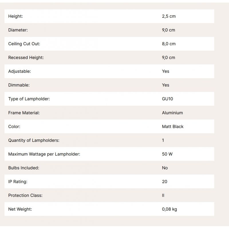 | Dimensiuni | diametru:9cm; inaltime:2,5cm; decupaj tavan:8cm |
