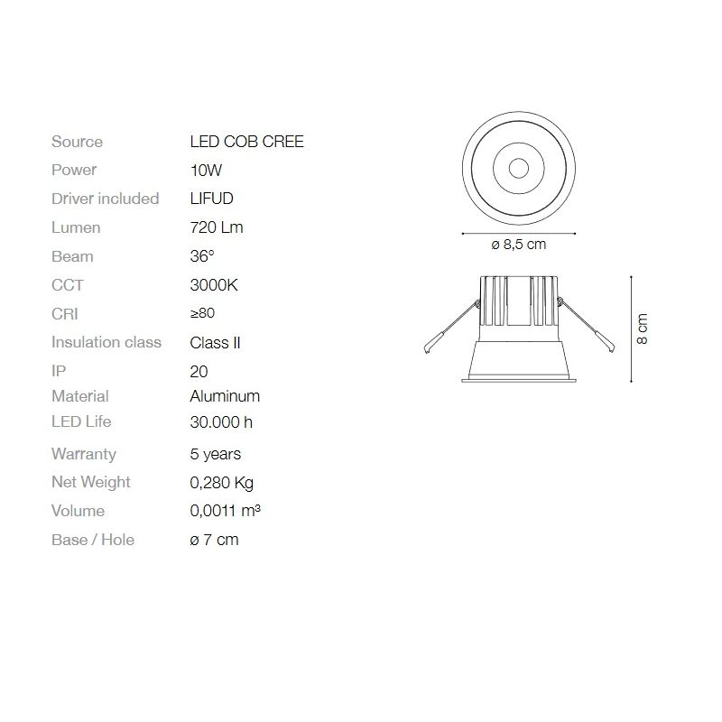| Putere | 10W COB LED 720Lm 3000K + driver inclus in pret 36°(unghiul de redare a fluxului luminos) |