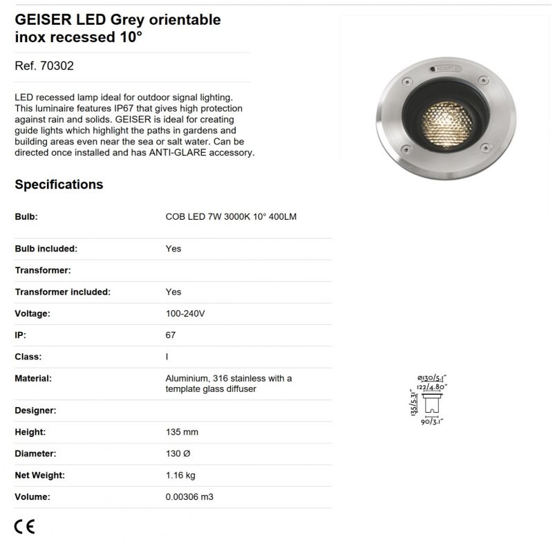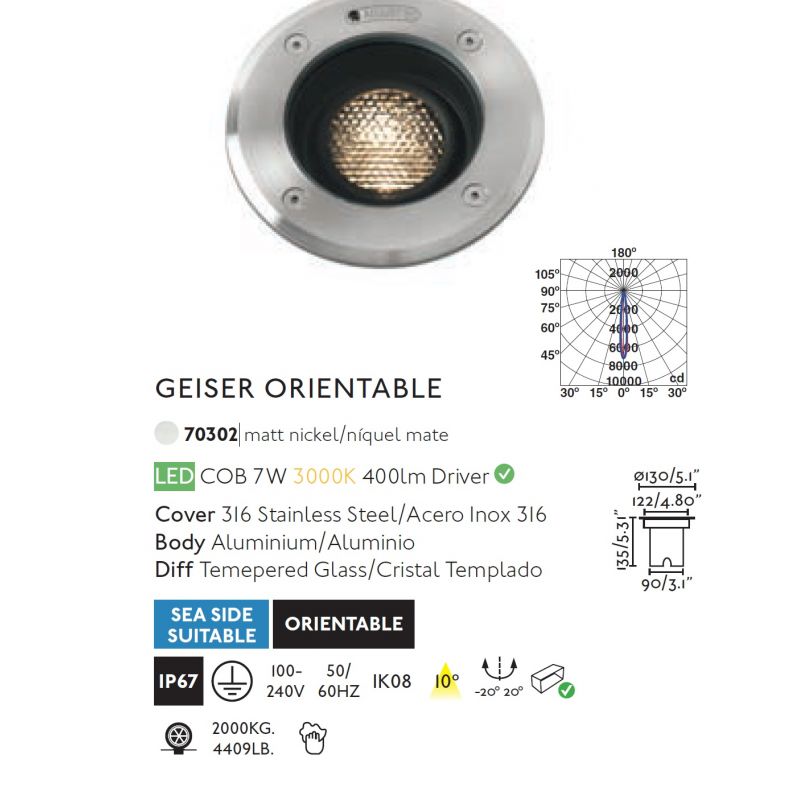 Informatii produs: | spot incastrabil, orientabil cu protectie IP67 special conceputa pentru exterior, spot incastrabil in pamant si pavaj, rezistent la socuri ce permite o sarcina pana la 2000 kg. |