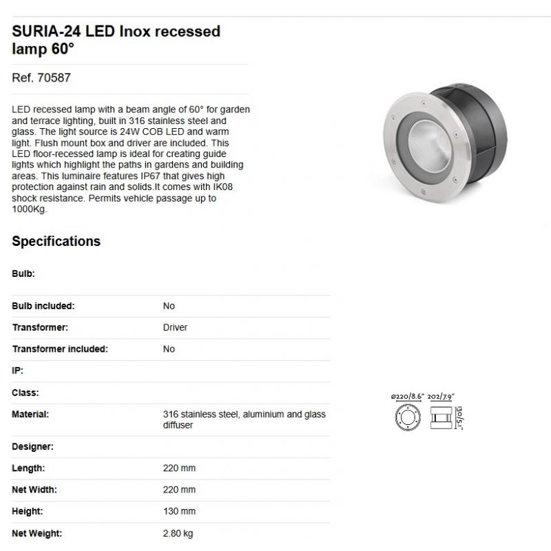 Informatii produs: | lampa de iluminat cu protectie IP67 special conceputa pentru exterior, spot incastrabil in pamant si pavaj, dotat cu IK08 rezistenta la socuri ce permite o sarcina pana la 1000 kg. |