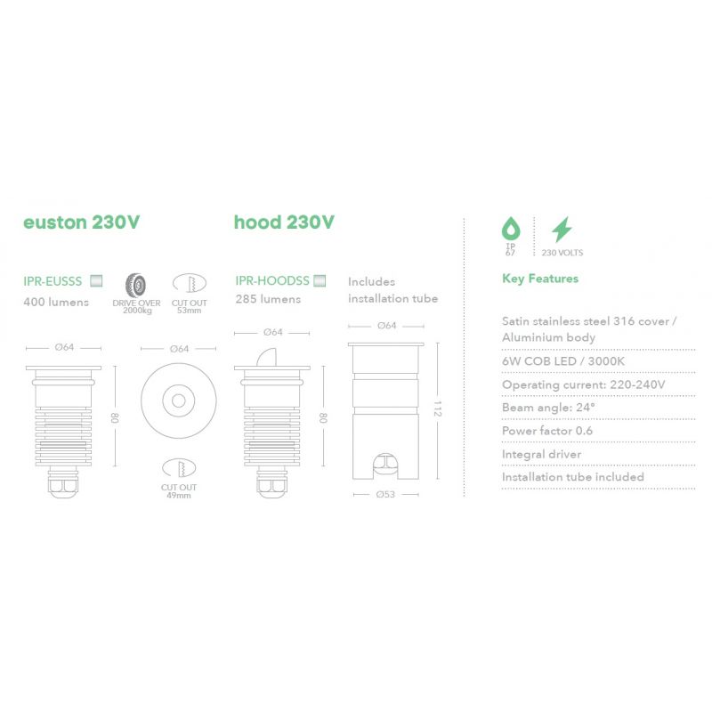 Materiale | otel satinat 316, corp din aluminiu, tub de incastrare inclus |