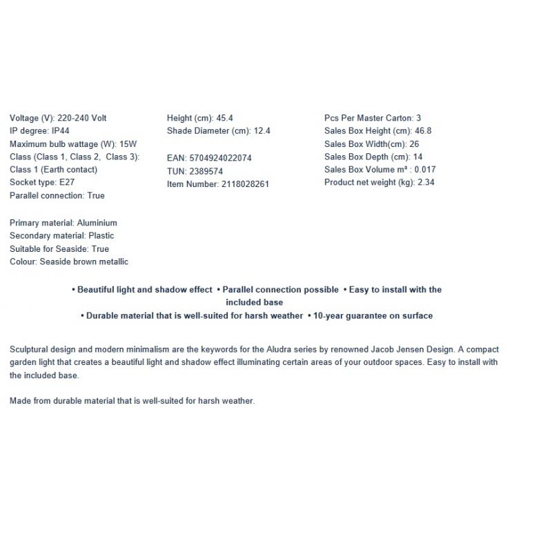 Informatii produs: | lampa de exterior cu protectie la umiditate IP44, usor de instalat cu baza inclusa |
