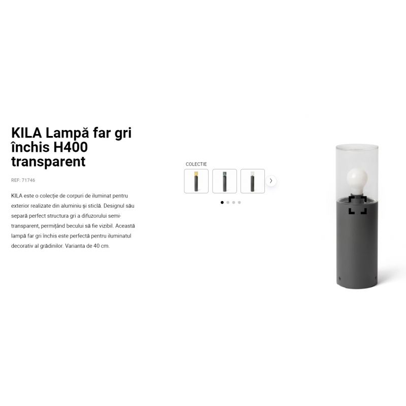 | Descriere | corp din aluminiu finisaj gri inchis, abajur de sticla transparenta |