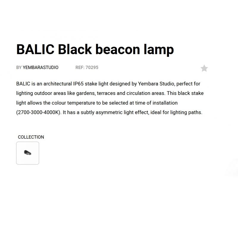 BALIC este o lampă arhitecturală IP65 proiectată de Yembara Studio, perfectă pentru iluminarea zonelor exterioare precum grădini, terase și zone de circulație. Această lampă neagră permite selectarea temperaturii culorii în momentul instalării (2700-3000-4000K). Are un efect de lumină subtil asimetric, ideal pentru iluminarea căilor.