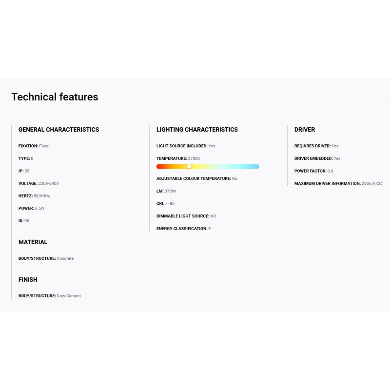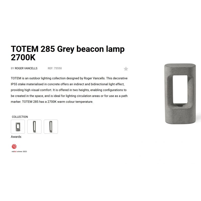 TOTEM este o colecție de iluminat pentru exterior concepută de Roger Vancells. Acest țăruș decorativ IP55 materializat în beton oferă un efect de lumină indirectă și bidirecțională, oferind un confort vizual ridicat. Este oferit în două înălțimi, permițând crearea unor configurații în spațiu și este ideal pentru iluminarea zonelor de circulație sau pentru a fi folosit ca marcator de traseu. TOTEM are o temperatură caldă de culoare de 2700K.