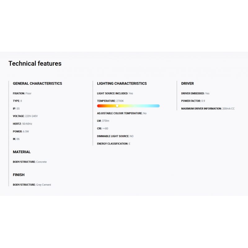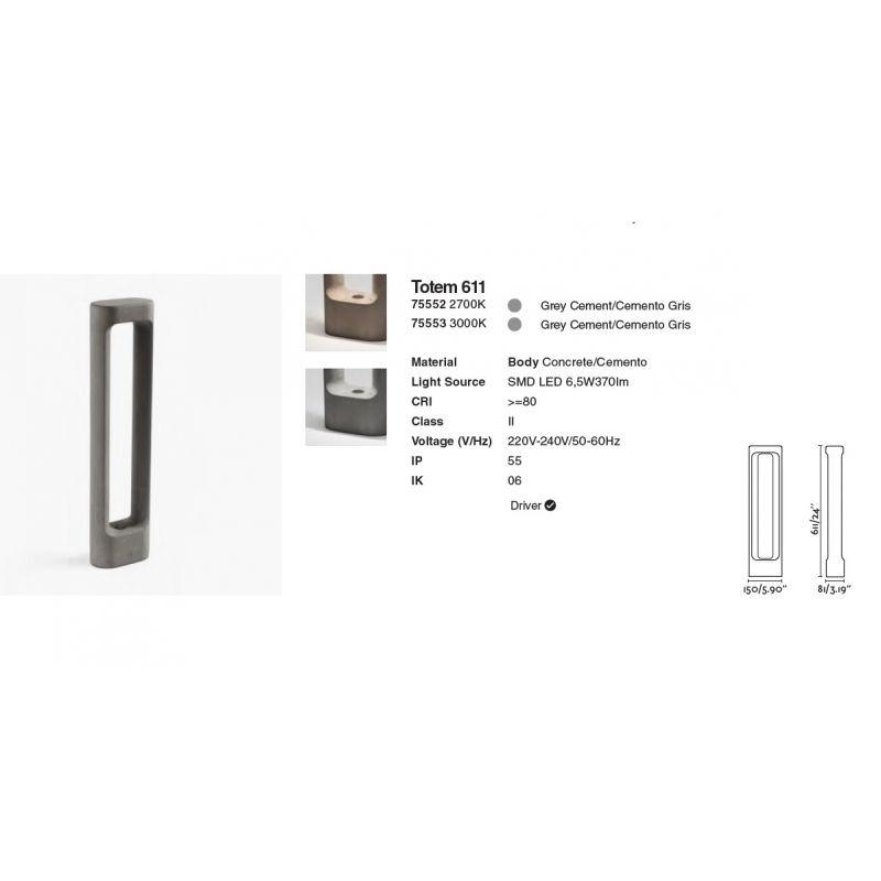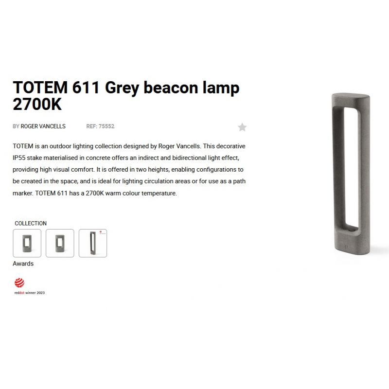 TOTEM este o colecție de iluminat pentru exterior concepută de Roger Vancells. Acest țăruș decorativ IP55 materializat în beton oferă un efect de lumină indirectă și bidirecțională, oferind un confort vizual ridicat. Este oferit în două înălțimi, permițând crearea unor configurații în spațiu și este ideal pentru iluminarea zonelor de circulație sau pentru a fi folosit ca marcator de traseu. TOTEM are o temperatură caldă de culoare de 2700K.