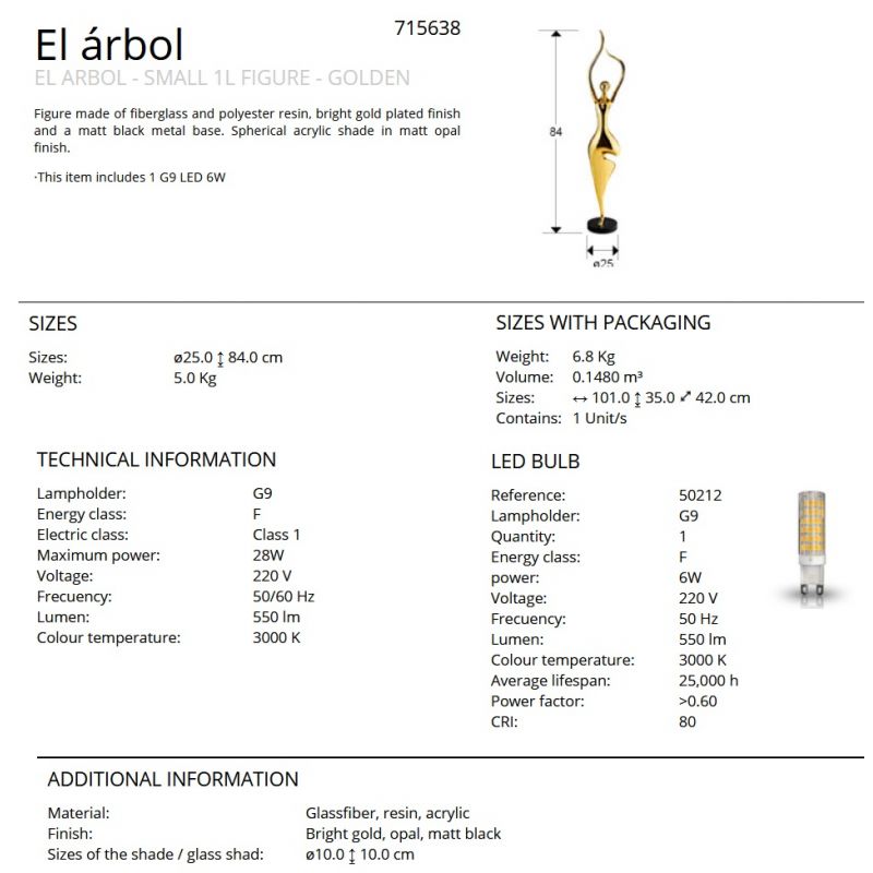 | Materiale | figurina din fibra de sticla si rasina poliester, abajur sferic acrilic cu finisaj opal mat |
